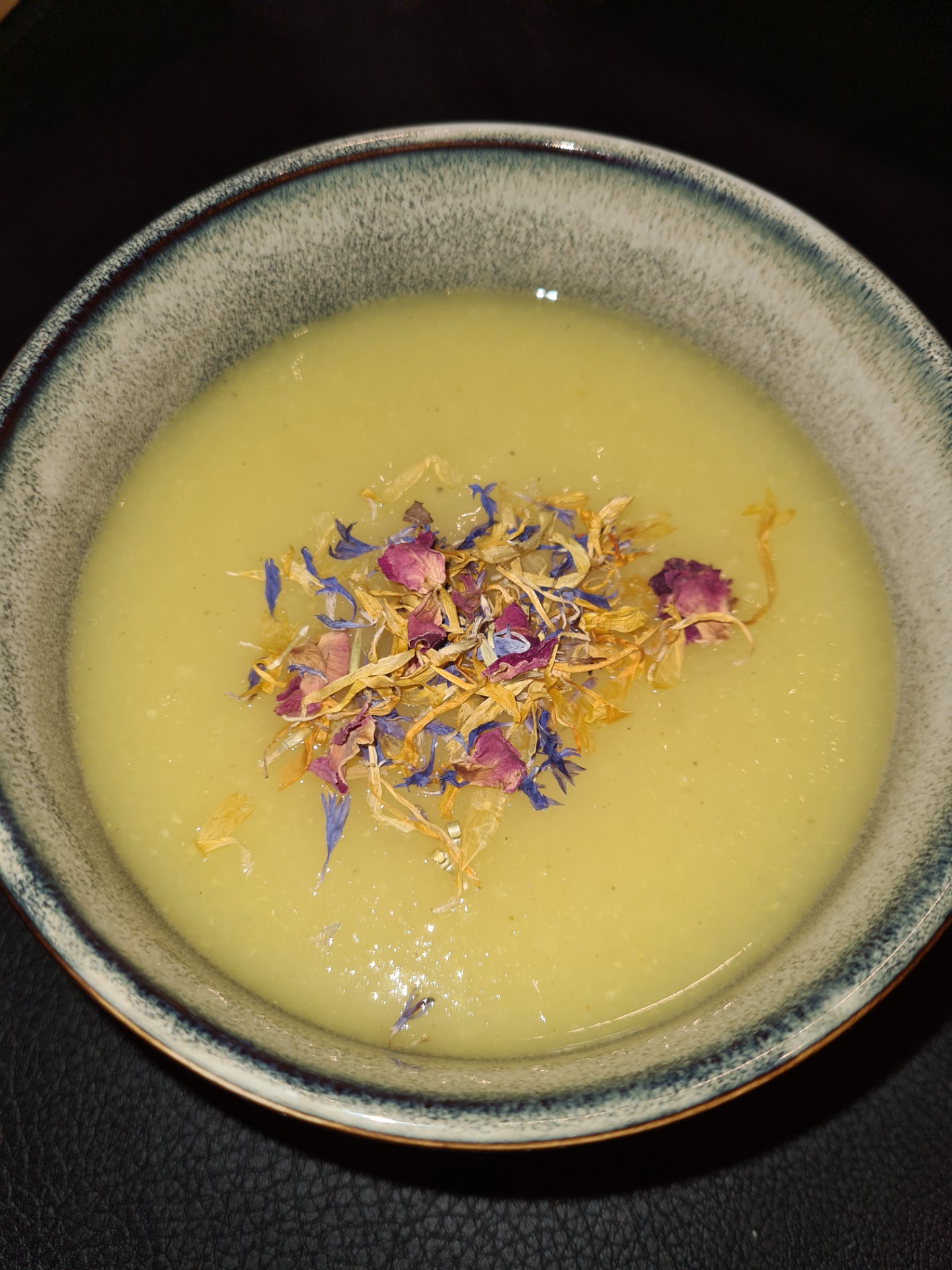 bereiding: 1 knolselder, ajuin (hoeveelheid naar keuze), groentenbouillonblokje, peper , zout, kurkuma en eetbare bloemetjes (te vinden op het internet en in sommige warenhuizen)